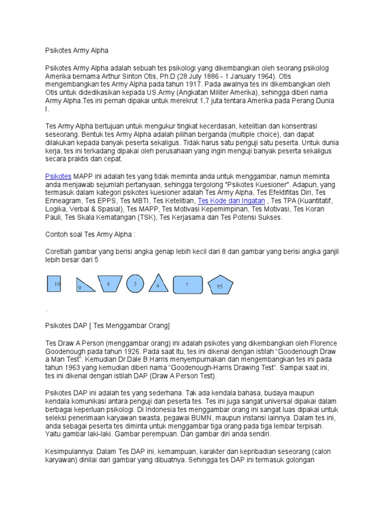 Alat Tes Tiu Tes Inteligensi Umum 5 6 Lengkap Dengan Kunci Jawaban Norma Nya Bonus Alat Tes Army Alpha Wartegg Test Pdf Download Gratis from docplayer.info Dalam tes ini kita akan diuji tentang daya tangkap, ketelitian, kecepatan, dan ketepatan dengan soal yang telah diberikan. Latihan soal psikotes ist psikotes dunia kerja. Salah satu soal terkadang memiliki kaitan dengan soal sebelumnya. 105+ contoh soal army alpha intelegence test + pembahasan. Tips panduan mengerjakan tes army alpha untuk meraih skor maksimal. Psikotest gambar tes spasial 4 tes 1 tes pengetahuan umum pdf. Untuk bisa mengerjakan tes psikotes army alpha, kuncinya cuma fokus, konsesntrasi penuh, dan tetap tenang (jangan panik atau khawatir). Psikotes dap tes menggambar orang tes draw a person (menggambar orang) ini adalah psikotes yang dikembangkan oleh florence goodenough pada tahun 1926.